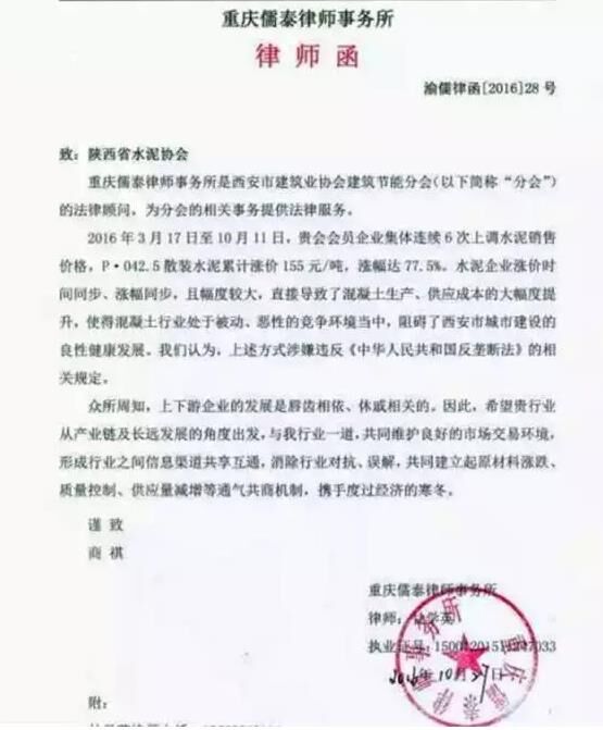 10月27日,鑒于陜西省內(nèi)水泥市場及混凝土市場發(fā)展情況,西安市建筑業(yè)協(xié)會建筑節(jié)能分會認為這一市場情況違法了《中華人民共和國反壟斷法》的相關(guān)規(guī)定,并向陜西省水泥協(xié)會發(fā)律師函。希望水泥行業(yè)從產(chǎn)業(yè)鏈及長遠發(fā)展的角度出發(fā),與混凝土行業(yè)一道,共同維護良好的市場交易環(huán)境,形成行業(yè)之間信息渠道共享互通,消除行業(yè)對抗、誤解,共同建立起原材料漲跌,質(zhì)量控制、供應(yīng)量減增等通氣共商機制,攜手度過經(jīng)濟寒冬。