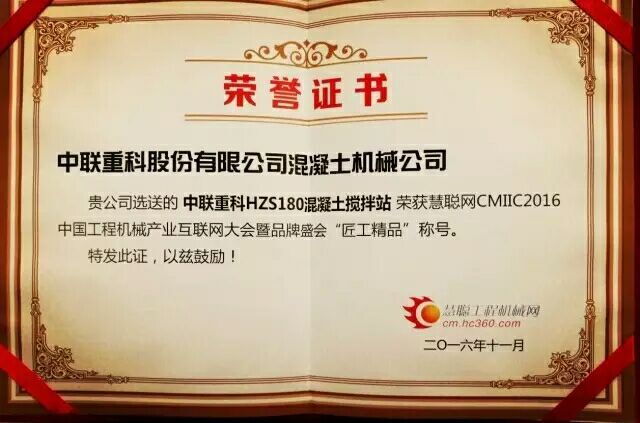 中聯(lián)重科HZSE180/HZS180產(chǎn)品4.0攪拌站榮獲CMIIC2016中國工程機(jī)械產(chǎn)業(yè)互聯(lián)網(wǎng)大會“匠工精品”稱號,這標(biāo)志著中聯(lián)重科4.0攪拌站產(chǎn)品得到了行業(yè)的充分認(rèn)可。