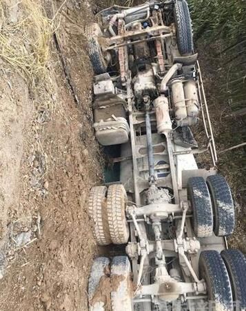 記者趕到現(xiàn)場從很遠(yuǎn)地方就可以看到一輛攪拌車橫躺在渠中,零部件散落一地,攪拌車有不同程度的受損。
