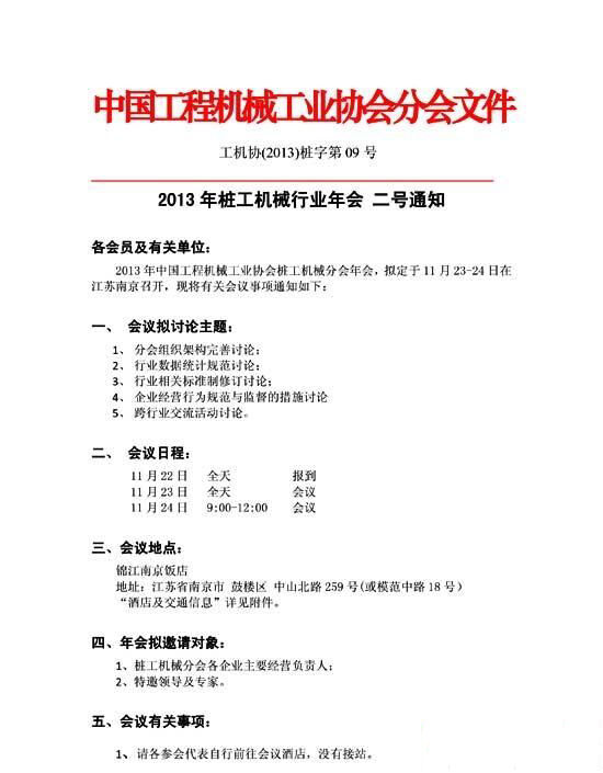 摘要:2013年中國工程機械工業(yè)協(xié)會樁工機械分會年會,將于11月23—24在江蘇南京錦江南京飯店召開。
