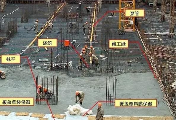 6、大體積泵送混凝土經(jīng)振搗后表面水泥漿較厚,容易引起表面裂縫。首先,要求在振搗最上一層混凝土?xí)r,控制振搗時(shí)間,注意避免表層產(chǎn)生太厚的浮漿層;在澆搗后,必須及時(shí)用2m 長(zhǎng)括尺,將多余浮漿層刮除,按照標(biāo)高控制點(diǎn),將混凝土表面括拍平整。有凹坑的部位必須用混凝土填平,在混凝土收漿接近初凝時(shí),混凝土面進(jìn)行二次抹光,用木蟹全面仔細(xì)打抹兩遍,既要確?;炷恋钠秸龋忠哑涑跗诒砻娴氖湛s脫水細(xì)縫閉合,在混凝土收漿凝固施工期間,除了具體施工人員外,不得在未干硬的混凝土面上隨意行走,收漿工作完成的面必須同步及時(shí)覆蓋薄膜。