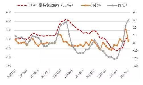 2017年一季度,水泥產(chǎn)量增速重回負增長。與水泥窯受錯峰政策影響導致熟料產(chǎn)量大幅下滑不同,水泥的生產(chǎn)實際上受到的限制并不多,產(chǎn)量能夠直接真實反映需求的情況。