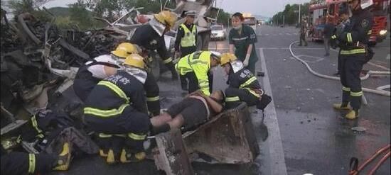 由于駕駛室變形嚴(yán)重,救援難度較大,為全力救出被困者,消防官兵首先利用擴(kuò)張器從左側(cè)車(chē)門(mén)擴(kuò)張,而后用撐頂桿對(duì)壓住被困者的變形車(chē)窗中間部位一點(diǎn)一點(diǎn)進(jìn)行擴(kuò)張,并小心翼翼地挪動(dòng)被困者的身體,發(fā)現(xiàn)車(chē)門(mén)位置已經(jīng)變形卡主被困人員,現(xiàn)場(chǎng)指揮員果斷命令用無(wú)齒鋸對(duì)車(chē)門(mén)部位切割并用戰(zhàn)斗服蓋住被困人員防止?fàn)C傷,水槍一直保持充實(shí)水柱狀態(tài)。