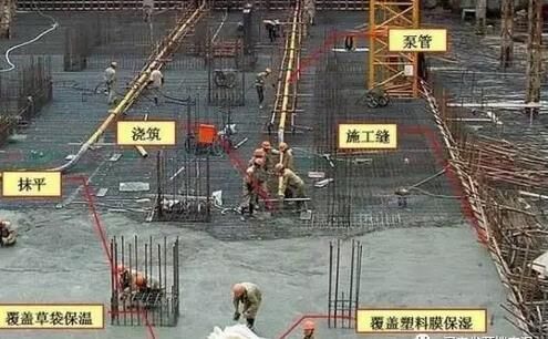 6、大體積泵送混凝土經(jīng)振搗后表面水泥漿較厚,容易引起表面裂縫。首先,要求在振搗最上一層混凝土?xí)r,控制振搗時間,注意避免表層產(chǎn)生太厚的浮漿層;在澆搗后,必須及時用2m 長括尺,將多余浮漿層刮除,按照標(biāo)高控制點,將混凝土表面括拍平整。有凹坑的部位必須用混凝土填平,在混凝土收漿接近初凝時,混凝土面進行二次抹光,用木蟹全面仔細(xì)打抹兩遍,既要確?;炷恋钠秸?,又要把其初期表面的收縮脫水細(xì)縫閉合,在混凝土收漿凝固施工期間,除了具體施工人員外,不得在未干硬的混凝土面上隨意行走,收漿工作完成的面必須同步及時覆蓋薄膜。