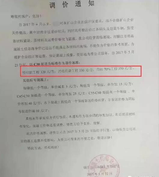 各建筑、施工單位——自2017年3月以來水泥連續(xù)調價,黃沙、石子等原材料大幅上漲,并供應緊張,混凝土行業(yè)各企業(yè)已無法正常運行,砼行業(yè)資金十分緊張,隨時有停產(chǎn)危險……