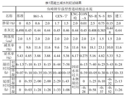 表1混凝土減水劑初試結(jié)果