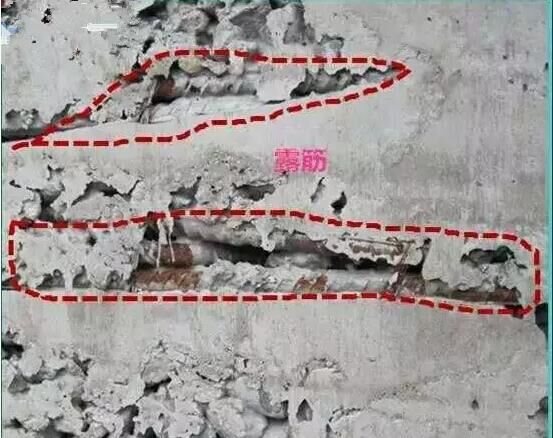 在鋼筋混凝土澆筑過(guò)程中振搗不到位,保護(hù)層墊塊沒(méi)有設(shè)置或者固定不牢固,混凝土坍落度小,或拆模早,混凝土硬化前受外力導(dǎo)致剝落而使構(gòu)件成型后鋼筋外露的現(xiàn)象。