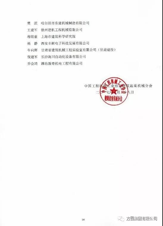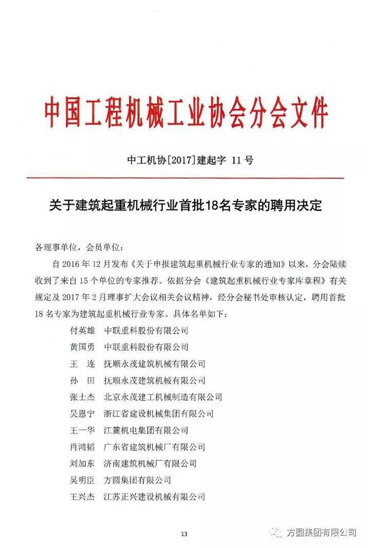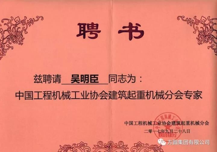 在11月9日召開的中國工程機械工業(yè)協會建筑起重機械分會年會上,以中工機協【2017】建起字11號文件公布了《關于建筑起重機械行業(yè)首批18名專家的聘用決定》,聘用首批18名專家為建筑起重機械行業(yè)專家,方圓集團副總工程師吳明臣名列其中。