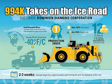 一旦機(jī)器安全到達(dá)客戶的施工現(xiàn)場(chǎng),真正的樂趣就開始了。Carlos與卡特彼勒代理商芬寧加拿大分部的四名機(jī)械師合作安裝了這臺(tái)長(zhǎng)18米的設(shè)備。Carlos非常喜歡客戶定期來到994K的安裝現(xiàn)場(chǎng),客戶對(duì)在施工現(xiàn)場(chǎng)使用這種新型Cat裝載機(jī)的興奮勁也讓他很開心?!翱吹竭@么大的設(shè)備Dominion Diamond很興奮,他們迫不及待地希望把它派上用場(chǎng)。”