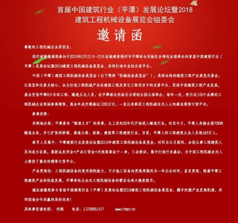 2018年2月21日-23日在福建省福州市平潭綜合實驗區(qū)臺灣創(chuàng)業(yè)園舉辦的首屆中國建筑行業(yè)(平潭)發(fā)展論壇暨2018建筑工程機械設備展覽會,共同打造專業(yè)性交易平臺。