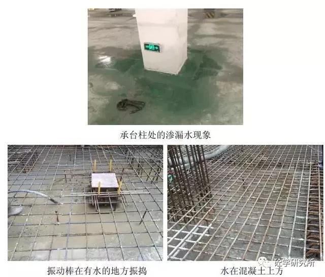 在工程實踐中,如積水未抽除,這些積水一部分會被混凝土吸收,從混凝土內部由下向上泌出,成為天然的泌水,成為后期“點”滲漏的薄弱環(huán)節(jié),如承臺處,積水可能會順著柱鋼筋向上泌出,在鋼筋附近形成由下向上的滲水通道,成為后期滲漏水的薄弱環(huán)節(jié);