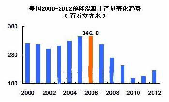 美國(guó)2000-2012年預(yù)拌混凝土產(chǎn)量變化趨勢(shì)(百萬(wàn)立方米)