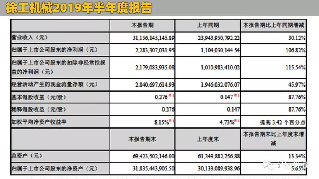 2019年上半年,徐工機(jī)械實現(xiàn)營業(yè)總收入311.56億元,同比增長30.12%。其中包括海外收入44.48億元,同比增長20.07%;歸屬于上市公司股東的凈利潤22.83億元,同比增長106.82%。相比較2018年上半年,今年上半年徐工的成績還是很喜人的,特別是在凈利潤這一塊,比去年同期增加了一倍之多。