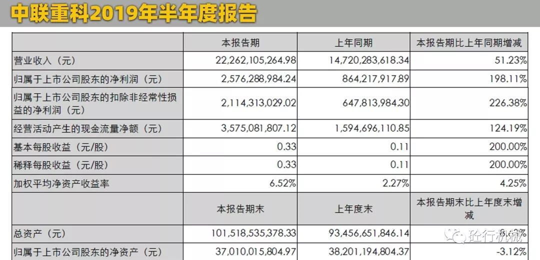 2019年上半年營業(yè)收入:222.62億元8月30日晚,中聯(lián)重科官方發(fā)布了2019年半年度報告。報告顯示,中聯(lián)重科上半年實現(xiàn)營業(yè)總收入222.6億元,同比增長51.23%;包括海外市場實現(xiàn)營業(yè)收入16.84億元,同比增長2.61%。歸屬于上市公司股東的凈利潤25.76億元,同比增長198.11%。相比較上面的徐工機(jī)械,雖然總營業(yè)額相差了88個多億,但是,凈利潤比徐工多了2.93億元。所以,從盈利能力來說,中聯(lián)表現(xiàn)比徐工要好。中聯(lián)重科的優(yōu)勢產(chǎn)業(yè)主要集中在混凝土機(jī)械、塔式起重機(jī)械、環(huán)衛(wèi)機(jī)械、農(nóng)業(yè)機(jī)械這四個領(lǐng)域為主,其中,建筑起重機(jī)械、長臂架泵車保持行業(yè)第一,汽車起重機(jī)國內(nèi)市場份額較年初增長6.8%。從目前中聯(lián)的發(fā)展趨勢來看,也在積極的擴(kuò)展高空作業(yè)平臺、土方機(jī)械、機(jī)制砂、干混砂漿、噴射機(jī)械手等新興業(yè)務(wù)。與此同時,中聯(lián)重科目前也在積極轉(zhuǎn)型,打造人工智能和智能制造,中聯(lián)重科塔機(jī)智能工廠穩(wěn)步達(dá)產(chǎn),高空作業(yè)平臺臂式智能產(chǎn)線實現(xiàn)量產(chǎn),攪拌車智能制造產(chǎn)業(yè)園、液壓關(guān)鍵元件產(chǎn)業(yè)園處于規(guī)劃建設(shè)中。作為老牌的國產(chǎn)工程機(jī)械品牌,中聯(lián)重科一直以來擁有很好的品牌口碑,特別是在混凝土機(jī)械領(lǐng)域,擁有眾多的明星產(chǎn)品,碳纖維長臂架泵車,國內(nèi)首創(chuàng),大受市場歡迎。