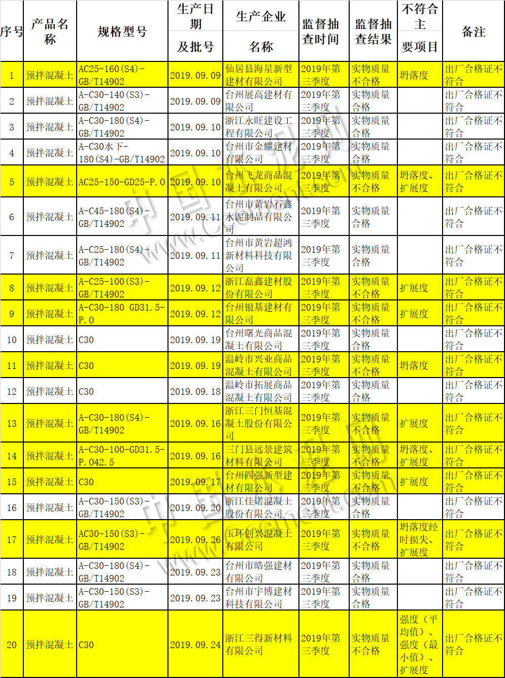 12月24日,臺州市市場監(jiān)督管理局官網(wǎng)發(fā)布2019年預(yù)拌混凝土產(chǎn)品質(zhì)量專項監(jiān)督抽查結(jié)果信息。近期,根據(jù)《中華人民共和國產(chǎn)品質(zhì)量法》、《浙江省產(chǎn)品質(zhì)量監(jiān)督條例》的規(guī)定,臺州市市場監(jiān)督管理局組織開展了2019年臺州市預(yù)拌混凝土產(chǎn)品質(zhì)量專項監(jiān)督抽查,涉及到臺州市有20家企業(yè)的20批次產(chǎn)品,其中實物質(zhì)量不合格10批次,實物質(zhì)量不合格率為50%。主要不符合項目為:強度、坍落度、坍落度經(jīng)時損失、擴展度。本次專項監(jiān)督抽查發(fā)現(xiàn)合格證普遍存在不符合現(xiàn)象。