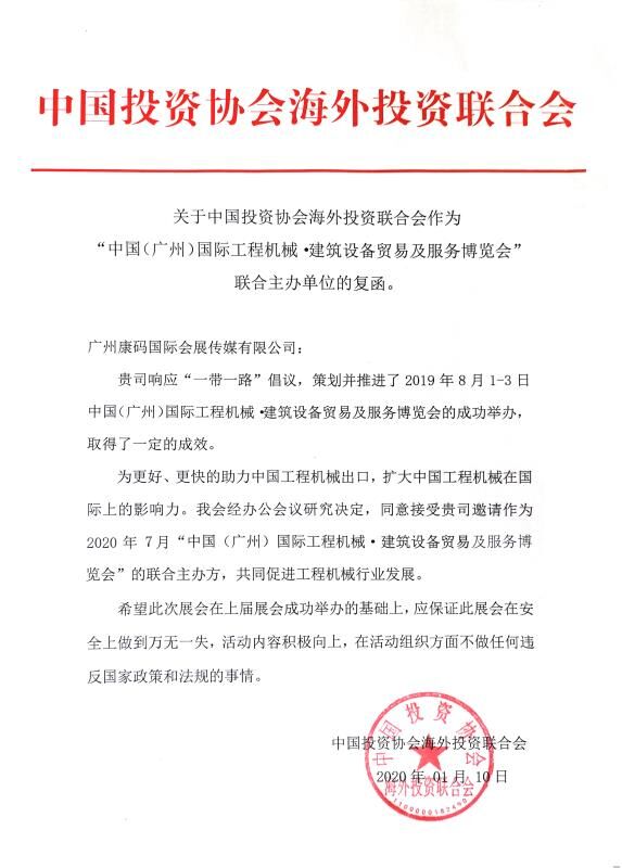 2019年開展的致力于促進(jìn)“工程機(jī)械、建筑設(shè)備國際貿(mào)易與服務(wù)”的康馬展的成功舉行后,展會承辦方康馬網(wǎng)董事長劉智向中國投資協(xié)會海外投資聯(lián)合會(簡稱海合會)劉雄英會長匯報展會工作,會長對展會發(fā)展給予了充分肯定的同時欣然接受康馬申請,同意作為2020年康馬展聯(lián)合主辦方,給康馬展注入更多海外資源、開拓展會各方渠道,相信在海合會聯(lián)合主辦指導(dǎo)下,2020康馬展將打造成具備國際影響力的工程建筑機(jī)械國際貿(mào)易標(biāo)桿展會。