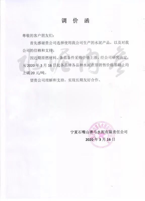 據(jù)消息:寧夏青銅峽水泥有限公司發(fā)布通知,稱由于近期原燃材料、備品備件采購(gòu)價(jià)格上漲,公司決定自3月19日起各品牌、各品種水泥在原有價(jià)格基礎(chǔ)上上調(diào)20元/噸。