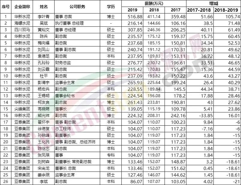 各大水泥集團(tuán)高管的工資排行榜