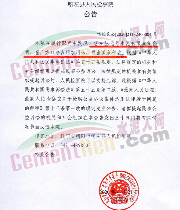 據(jù)了解,4月21日,遼寧省朝陽市喀左縣人民檢察院在履行職責中發(fā)現(xiàn),喀左叢元號水泥有限責任公司、崔廣方非法占用農用地,損害國家利益。根據(jù)《中華人民共和國民事訴訟法》第五十五條規(guī)定,法律規(guī)定的機關和有關組織可以提起民事公益訴訟,法律規(guī)定的機關和有關組織提起訴訟的,人民檢察院可以支持起訴。