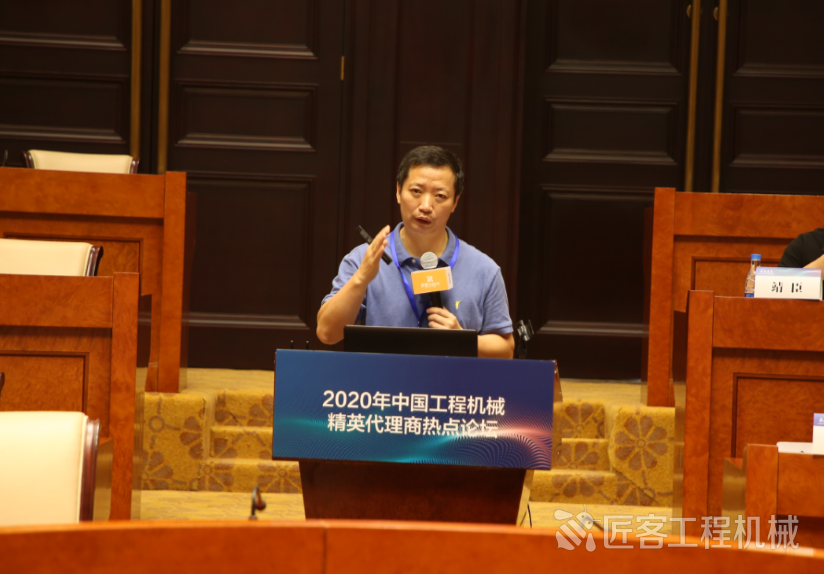 中國(guó)工程機(jī)械工業(yè)協(xié)會(huì)代理商工作委員會(huì)秘書長(zhǎng)、匠客工程機(jī)械傳媒總經(jīng)理?xiàng)钪痉贾鞒稚衔绲臅?huì)議并發(fā)言