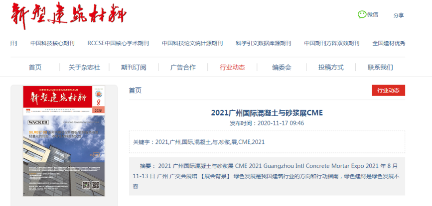 廣州國際混凝土及砂漿展已于2020年成功舉辦,自項目立項以來,得到多方媒體的關(guān)注和報道。據(jù)統(tǒng)計,2020-2021年度,騰訊視頻、愛奇藝、土豆網(wǎng)、優(yōu)酷視頻等電視媒體,網(wǎng)易房產(chǎn)、新浪家居、廣州搜狐焦點、騰訊網(wǎng)、中國數(shù)字經(jīng)濟網(wǎng)、央廣網(wǎng)、360慧聰網(wǎng)、南方網(wǎng)、北方網(wǎng)、羊城晚報、廣州日報、新浪網(wǎng)、新京報、21世紀(jì)經(jīng)濟報道、東方網(wǎng)、光明網(wǎng)、中國商業(yè)新聞網(wǎng)、焦點中國網(wǎng)等主流媒體,抖音、快手、西瓜視頻、今日頭條、百家號、火山小視頻等視頻媒體和廣東建設(shè)報、中國路面機械網(wǎng)、新型砂漿網(wǎng)、世界機械網(wǎng)、工程機械在線、攪拌設(shè)備網(wǎng)、中國保溫砂漿網(wǎng)等行業(yè)媒體,以及《混凝土雜志》、《砼時代》等雜志媒體均對展會給予高度關(guān)注,積極宣傳展會動態(tài)與資訊。感謝各行業(yè)媒體、主流媒體、視頻媒體、雜志的大力支持與高度認可。