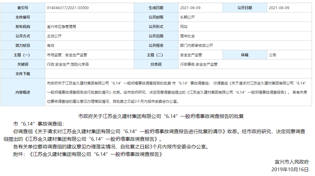 2021年6月9日,江蘇省宜興市人民政府官網(wǎng)發(fā)布《關(guān)于江蘇金久建材集團(tuán)有限公司“6.14”一般坍塌事故調(diào)查報告的批復(fù)》,對一起因筒庫坍塌造成2死1傷的事故進(jìn)行通報。