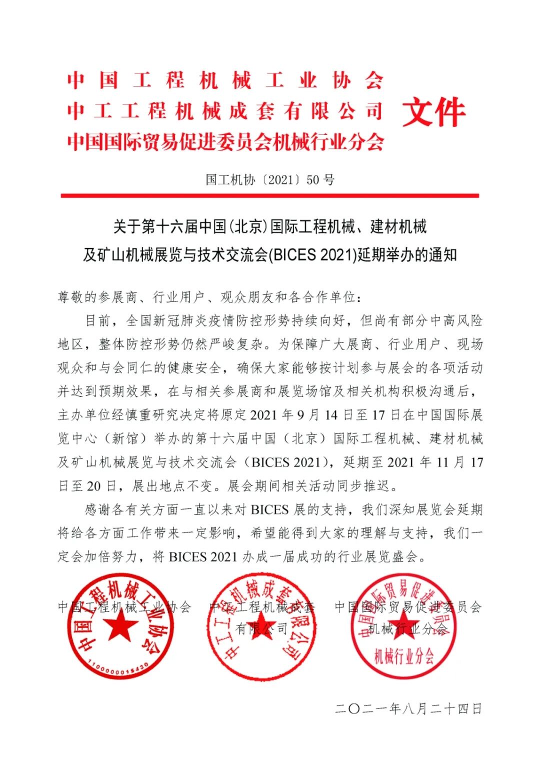 關于第十六屆北京工程機械展BICES 2021延期舉辦的通知