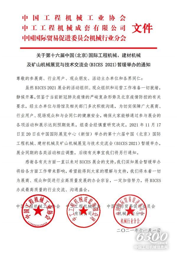 BICES 2021組委會(huì)于2021年11月1日下午下發(fā)了關(guān)于第十六屆中國(guó)(北京)國(guó)際工程機(jī)械、建材機(jī)械及礦山機(jī)械展覽與技術(shù)交流會(huì)(BICES 2021)暫緩舉辦的通知,延期時(shí)間未定。
