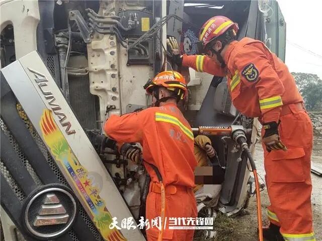 到達(dá)現(xiàn)場后,指揮員立即下車對現(xiàn)場情況進(jìn)行偵查,發(fā)現(xiàn)事故車輛是一臺裝滿了35噸混凝土的罐車,由于雨天路滑,司機(jī)行駛到一段下坡路時因操作不當(dāng)發(fā)生側(cè)翻。駕駛員被困在駕駛室內(nèi),駕駛室已嚴(yán)重變形,無法將車門正常開啟,現(xiàn)場醫(yī)護(hù)人員正為司機(jī)輸液補(bǔ)充能量。