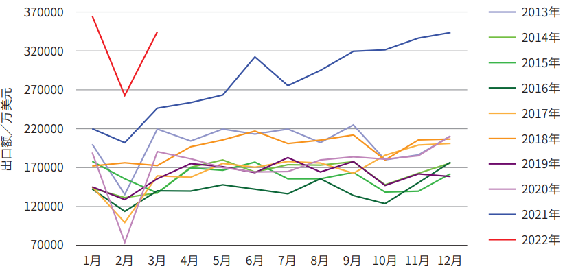 根據(jù)海關(guān)數(shù)據(jù)整理,2021年1-3月我國(guó)工程機(jī)械進(jìn)出口貿(mào)易額為105.08億美元,同比增長(zhǎng)36%。其中進(jìn)口金額7.85億美元,同比下降22.8%;出口金額97.23億美元,同比增長(zhǎng)45%,貿(mào)易順差89.38億美元,同比增加32.49億美元。2022年1-3月各月進(jìn)出口情況如表1所示,2013年-2022年月度出口金額如圖1所示。