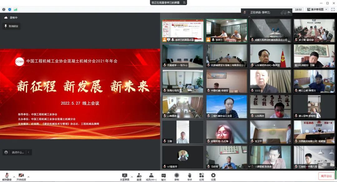 2022年5月27日,以“新征程 新發(fā)展 新未來(lái) ”為主題的中國(guó)工程機(jī)械工業(yè)協(xié)會(huì)混凝土機(jī)械分會(huì)年會(huì)在線上隆重召開(kāi)。中國(guó)工程機(jī)械工業(yè)協(xié)會(huì)會(huì)長(zhǎng)蘇子孟、名譽(yù)會(huì)長(zhǎng)祁俊、協(xié)會(huì)顧問(wèn)龍國(guó)鍵、副秘書(shū)長(zhǎng)呂瑩、副秘書(shū)長(zhǎng)王金星、副秘書(shū)長(zhǎng)尹曉荔、其他分支機(jī)構(gòu)領(lǐng)導(dǎo)、混凝土機(jī)械分會(huì)會(huì)長(zhǎng)符忠軒、名譽(yù)會(huì)長(zhǎng)盛春芳、秘書(shū)長(zhǎng)李祥蘭、顧問(wèn)易君、分會(huì)秘書(shū)處、分會(huì)理事及會(huì)員單位相關(guān)負(fù)責(zé)人、行業(yè)上下游企業(yè)與行業(yè)專(zhuān)家等在內(nèi)的兩百余人參與此次會(huì)議。