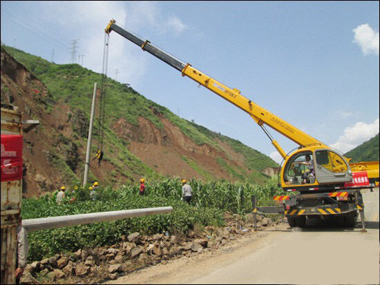 筆者連線徐工起重機(jī)事業(yè)部駐云南辦事處卞泳主任,他介紹了相關(guān)情況。8月7日上午,魯?shù)榭h城通往震中龍頭山鎮(zhèn)的道路經(jīng)過兩日的搶修和交通管制已基本暢通,武警交通部隊(duì)決定允許放行小型汽車起重機(jī)。指揮部要求南方電網(wǎng)公司迅速完成龍頭山鎮(zhèn)幾處電線桿及變壓設(shè)備的安裝。南方電網(wǎng)公司考慮道路情況惡劣,決定征用一直等候在交通管制境界線之外的一臺(tái)徐工QY12B.5汽車起重機(jī),徐工12噸起重機(jī)迅速到達(dá)現(xiàn)場(chǎng)投入搶修。