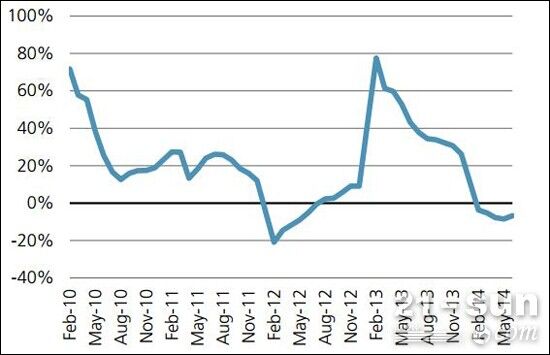 2014年上半年,商品房銷售面積累計(jì)下降6%,銷售額下降7%,房屋新開工面積累計(jì)同比下降16.5%;房屋施工面積累計(jì)同比增長11.3%,增速較2013年的16.1%明顯下降。展望2014年下半年,由于2013年下半年商品房銷售面積達(dá)7.9億平米,絕對水平較高,因此該行預(yù)計(jì)下半年銷售面積下降幅度有擴(kuò)大的可能,從而壓制開發(fā)商的房地產(chǎn)建設(shè)活動。