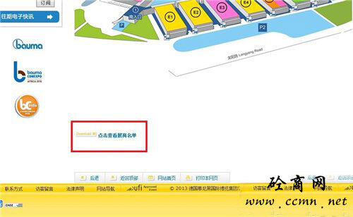 1.電腦用戶可以直接在bauma China 2014的官方網(wǎng)站上查看(按步驟點(diǎn)擊紅色方框部分即可)