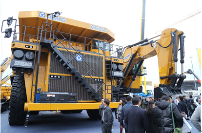 徐工在bauma2014上展出XDE240大型電傳動(dòng)礦用自卸車,該車載重量230t,額定功率2500hp,發(fā)動(dòng)機(jī)配置MTU16v4000,發(fā)電機(jī)采用GE GTA-41,牽引電機(jī)采用GE B25,輪邊減速比為31.8:1,采用交—直—交電傳動(dòng)技術(shù)