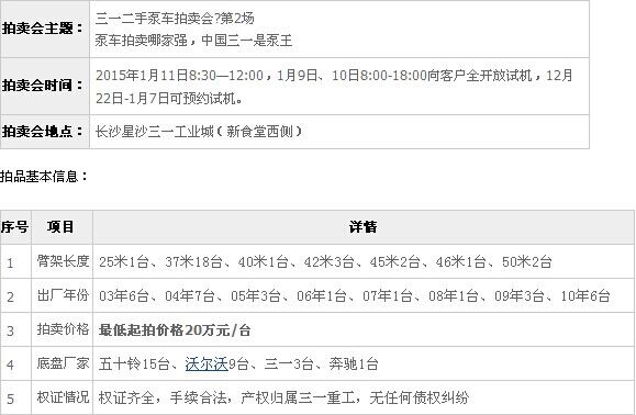 泵車(chē)拍賣(mài)會(huì)第2場(chǎng)將于2015年1月11日在湖南長(zhǎng)沙三一工業(yè)城舉行。