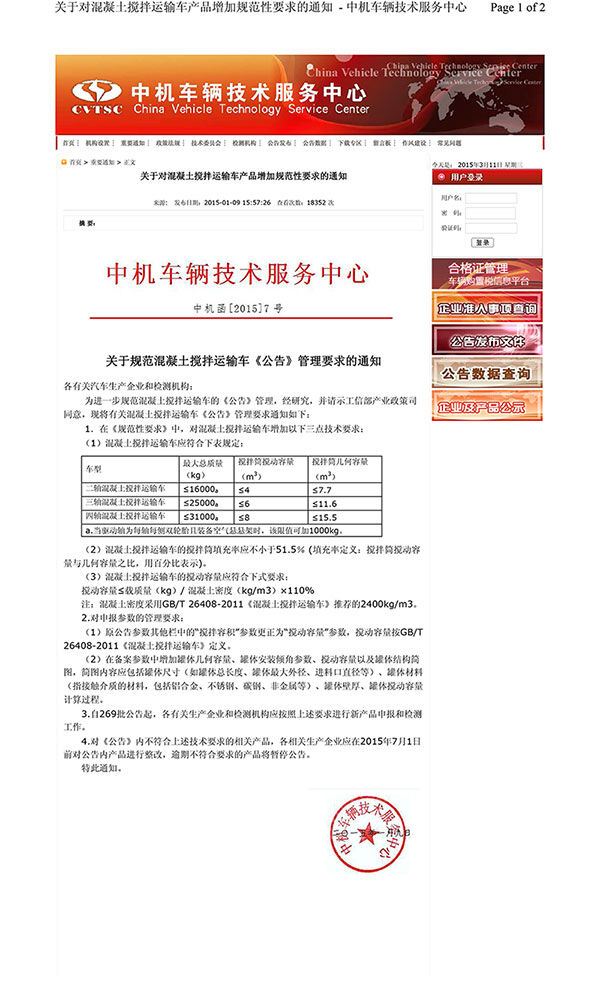 根椐國家有關(guān)依法治國的精神,嚴(yán)格執(zhí)行國家法律、標(biāo)準(zhǔn)的有關(guān)規(guī)定,中機(jī)車輛技術(shù)服務(wù)中心根據(jù)中國工業(yè)信息化部產(chǎn)業(yè)政策司意見,印發(fā)中機(jī)函[2015]7號文向相關(guān)單位下發(fā)。此文明確了混凝土攪拌運(yùn)輸車三點技術(shù)要求(原文見附件),并于2015年7月1日前對公告產(chǎn)品進(jìn)行整改,逾期者將暫仃公告。椐此,特向全國廣大攪拌運(yùn)輸車生產(chǎn)商和使用者予以提示,希望大家認(rèn)真嚴(yán)格執(zhí)行。