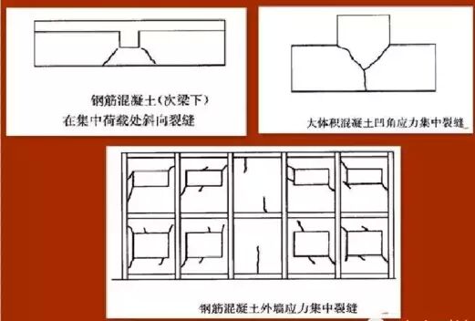 裂縫一般特征: 應(yīng)力集中裂縫一般發(fā)生在門窗洞口的角部和平立面突出凹進(jìn)的轉(zhuǎn)角處,且斜向楔形狀裂縫居多。在集中荷載較大的部位,易產(chǎn)生劈裂狀的裂縫。在預(yù)應(yīng)力結(jié)構(gòu)錨固端的局部承壓處,有時出現(xiàn)一條或數(shù)條裂縫,并呈放射形狀。