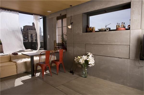 床的亮點設計在于它是可以伸縮的。白天可以推進去,這里充當飄窗的作用。墻面也是頗有創(chuàng)意和實用性,隱藏在墻上的混凝土板,拉下來變成方便的書桌或是餐桌。