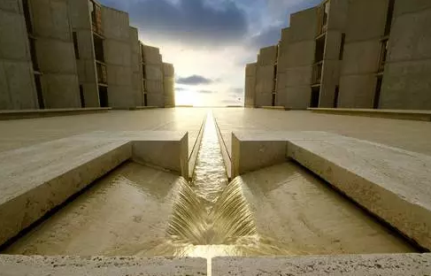 路易斯·康設(shè)計(jì)的加利福尼亞索爾克研究所,是一件大師級的作品。這里既是“具有學(xué)術(shù)氛圍的隱居之所”,也是科學(xué)研究的靈感之地?;炷恋臐仓昧藦牧_馬建筑研究汲取的技術(shù)。為了充分體現(xiàn)混凝土材料的特色,建筑師在材料設(shè)計(jì)完成后沒有再做任何的裝飾。