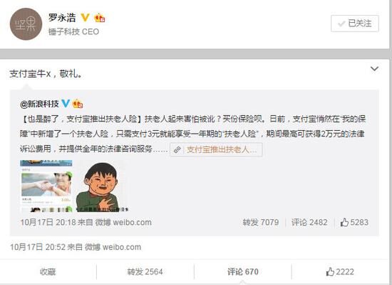 “扶老人險”一上線立即引起了網(wǎng)友們的熱議,就連羅永浩老師也在微博上公開力挺,而據(jù)支付寶方面的統(tǒng)計,該險種開售3天便有2.6萬人投保,可見其關注度。