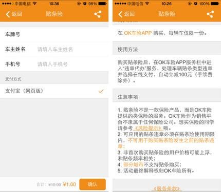 貼條險是由《OK車險》在今年3月推出的險種,用戶需支付1元,若愛車不幸被貼條可減免100元,保障期為一年,使用后可重復購買但價格會相應提高。這款保險同樣銷售火爆,幾天時間即賣出了上萬份,《OK車險》也因此名聲大噪。