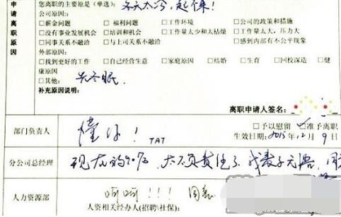 部門負(fù)責(zé)人回復(fù):“懂你,TAT”;分公司總經(jīng)理回復(fù):“現(xiàn)在的90后,太不負(fù)責(zé)任了,我表示無(wú)語(yǔ)。同意”;人力資源部回復(fù):“呵呵!??!同意”。