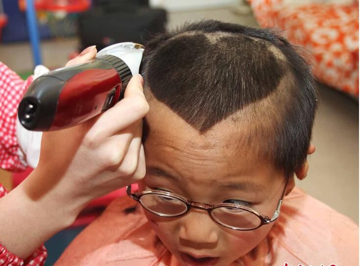 一個(gè)孩子正在“剃喜頭”。