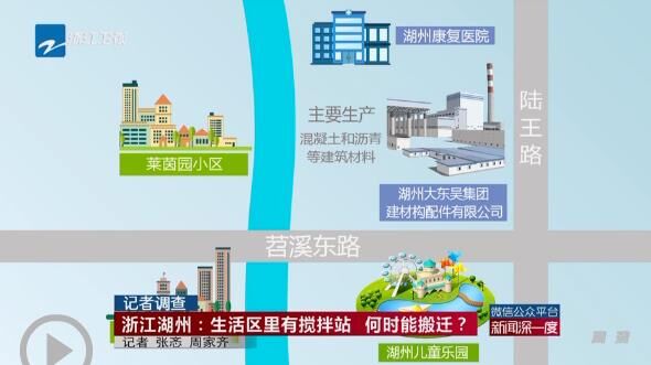 湖州大東吳集團(tuán)建材構(gòu)配件有限公司位于湖州市苕溪東路和陸王陸交叉口北側(cè),主要生產(chǎn)混凝土和瀝青等建筑材料。在它的西面,隔著一條河,就是萊茵園小區(qū)和尊園小區(qū)。它的北面是湖州康復(fù)醫(yī)院和養(yǎng)老院,南面則是即將竣工的湖州兒童樂園(圖)