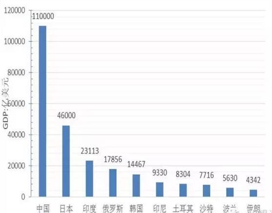從經(jīng)濟(jì)總量看,GDP超過1萬億美元的國家5個,分別為中國、日本、印度、俄羅斯、韓國,其中中國經(jīng)濟(jì)總量為11萬億美元、位居第一、為最小國家不丹的5800倍,約占“一帶一路”地區(qū)經(jīng)濟(jì)總量的40%;GDP在5000億到1萬美元的國家4個,分別是印尼、土耳其、沙特、波蘭;GDP在1000億到5000億美元的國家19個,GDP在100億到1000億美元的國家30個;低于100億元美元的國家8個,分別為塔吉克斯坦、蒙古、吉爾吉斯坦、摩爾多瓦、巴勒斯坦、黑山、馬爾代夫、不丹,其中經(jīng)濟(jì)規(guī)模最小為不丹、GDP為19億美元。