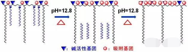 其次,快速水解型聚醚單體應(yīng)用,由于水泥水化前期速度較快,自由水消耗較多,在低自由水量前提下,通過(guò)調(diào)控水解釋放速率與側(cè)鏈脫落、水化掩埋之間的平衡,既有效降低前期流動(dòng)度損失,又避免后期反向增長(zhǎng)??焖偎馓峁┓稚?dòng)力作用示意圖如下: