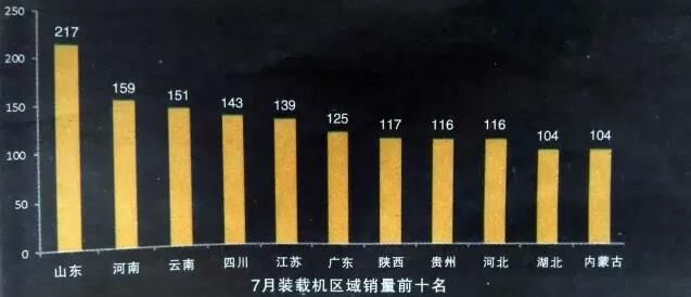 今年前7月,除2月份出口量不足800臺,其它月份出口數量基本均在1000~1300臺的區(qū)間內上下波動,相對比較平穩(wěn)。分區(qū)域來看,山東省繼續(xù)保持領先,7月份銷量達到217臺,其余省份銷量均未達到200臺,天津、上海、青海、海南、西藏等仍是銷量最少的省、市、自治區(qū)。