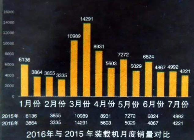 據公布的數據,7月份全國26家主要裝載機生產企業(yè)共銷售各類裝載機4221臺,同比2015年7月份的4992臺,下降15.44%;環(huán)比6月份的4867臺,下降13.27%。其中3噸及以上裝載機銷量為3796臺,3噸以下小型裝載機銷量為425臺。從細分類型來看,3噸及5噸裝載機為主力銷售機型,合計銷量占比達到80%。綜合來看前7月銷量,除3月份曇花一現(xiàn)般同比大幅增長30.05%外,其余月份裝載機銷量均在下滑。但一個積極的現(xiàn)象是,4月份以來裝載機雖持續(xù)下滑,但降幅一直在收窄,自4月份的37.26%收窄到7月份的15.44%。