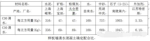 最終,第四段樣板墻實踐完成后,根據(jù)業(yè)主、監(jiān)理、設計等各方的意見最終明確正式清水混凝土施工的配合比: